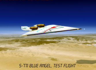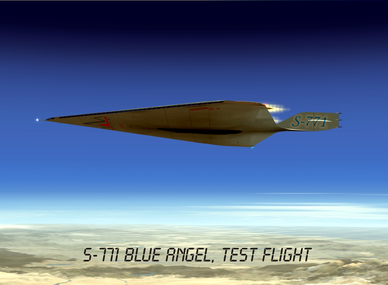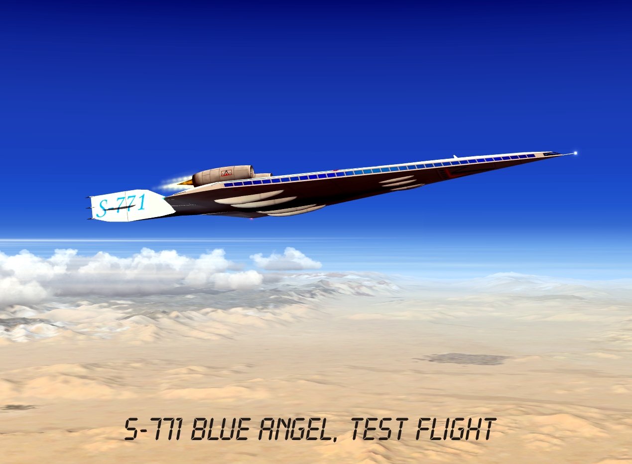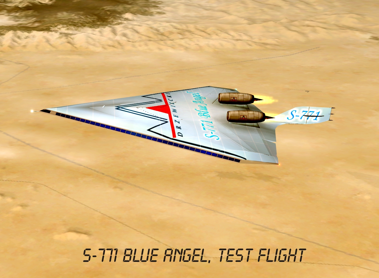 Drzewiecki S-771 Blue Angel futuristic project was inspired by the Boeing X-48 prototype and other blended-wings designs. Its fuselage works as a huge wing with a specific profile. Aircraft's size is quite similar to modern heavy jetliners (55x88x13), however it can take aboard 800 passengers and fly over 2 Ma on a maximum altitude of 60.000ft.