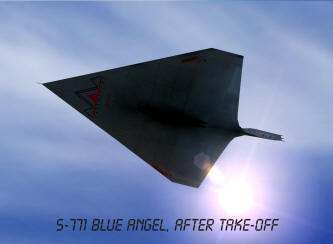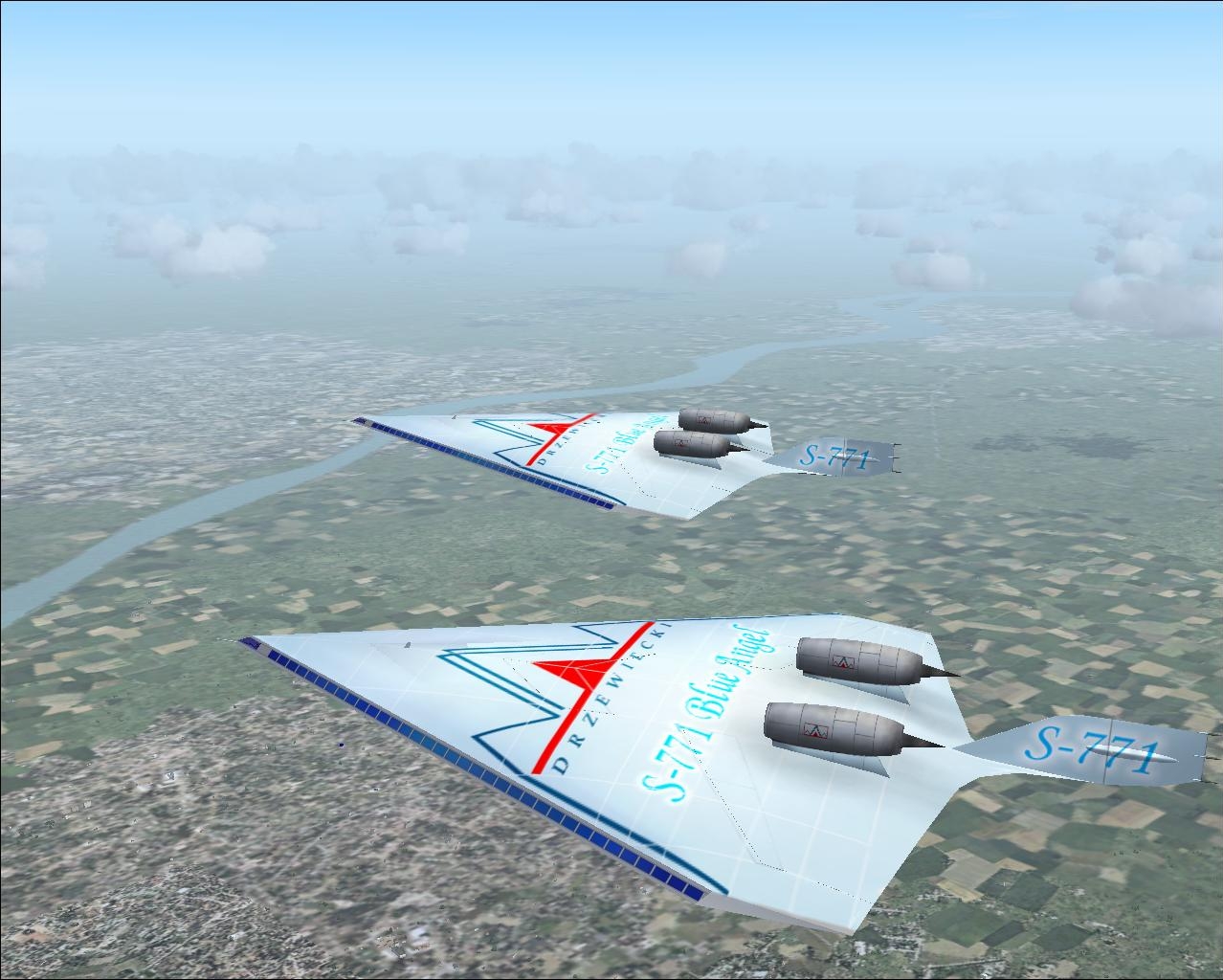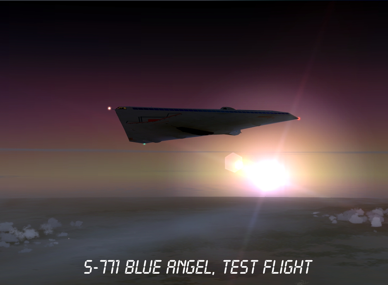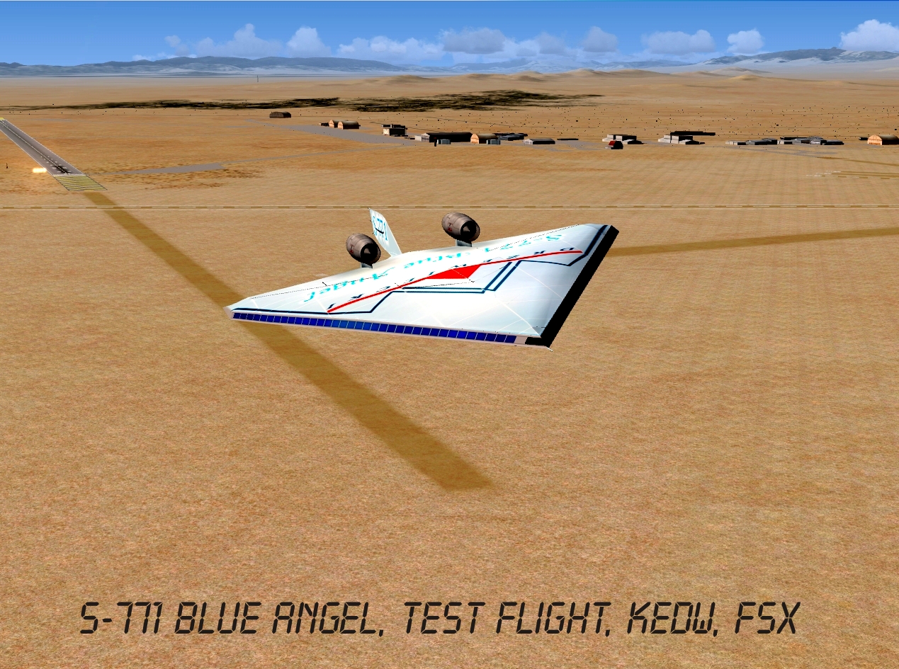 Drzewiecki S-771 Blue Angel futuristic project was inspired by the Boeing X-48 prototype and other blended-wings designs. Its fuselage works as a huge wing with a specific profile. Aircraft's size is quite similar to modern heavy jetliners (55x88x13), however it can take aboard 800 passengers and fly over 2 Ma on a maximum altitude of 60.000ft.