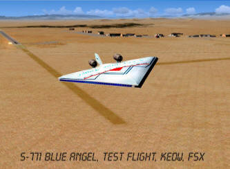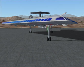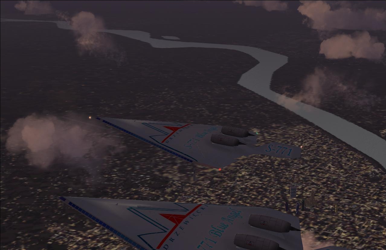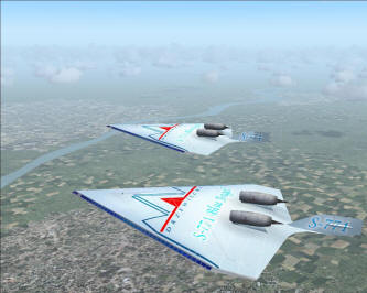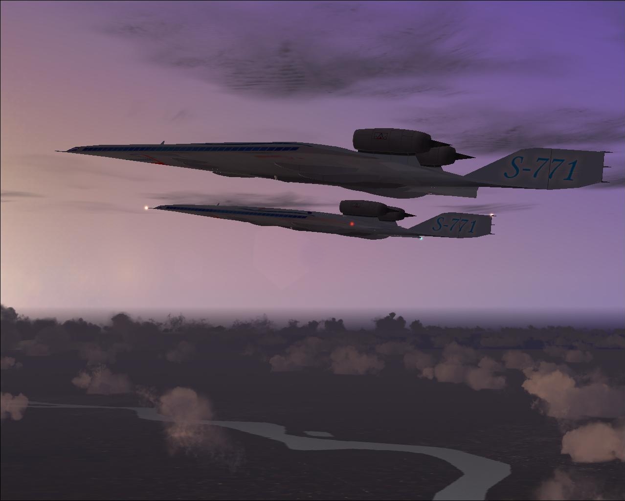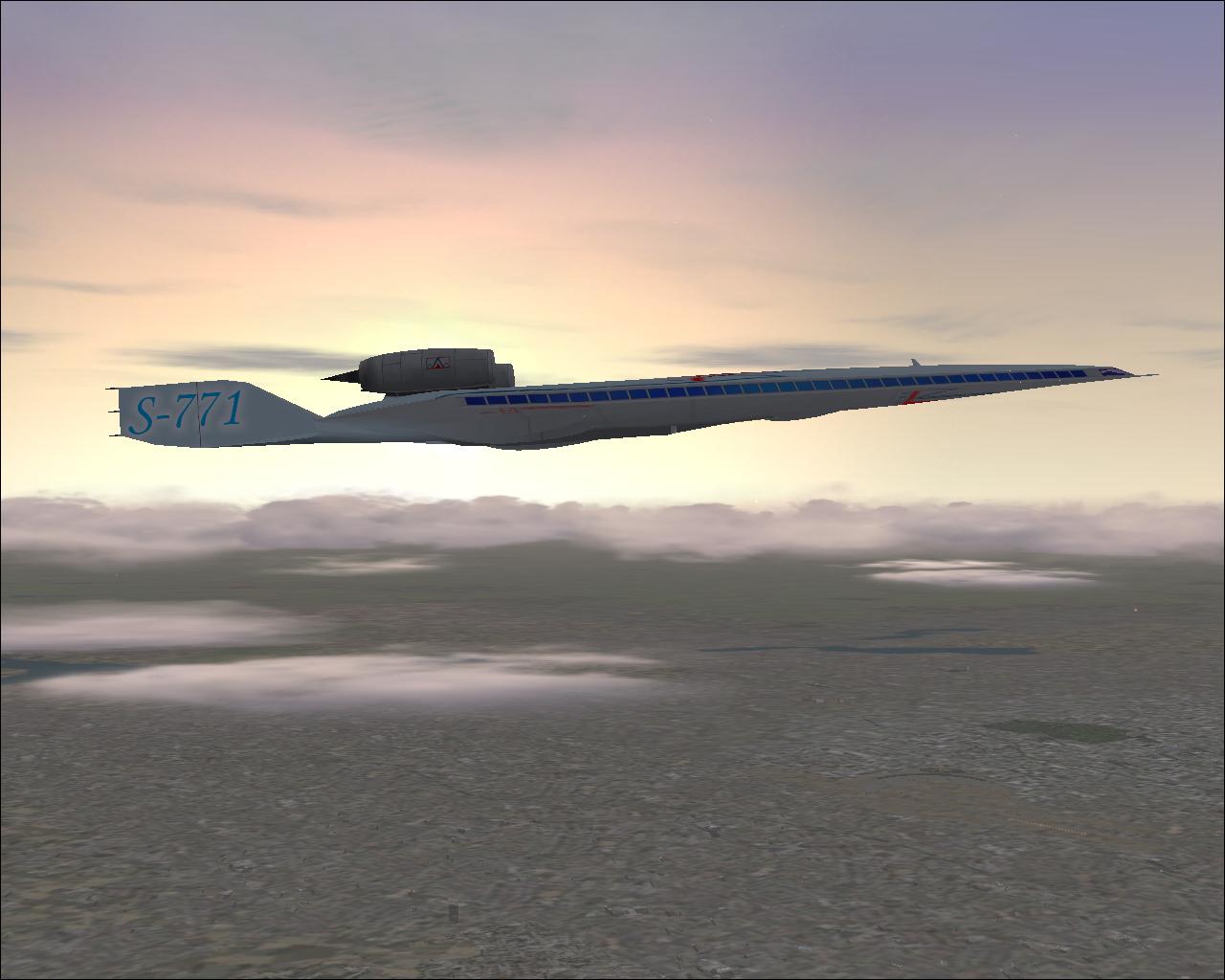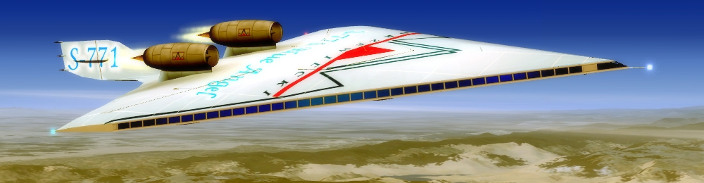 S-771 is powered by two hydrogen engines situated on top of the fuselage. Inside there is a tank with a liquid hydrogen, which is pumped to the engines. Due to the chemical reaction of mixiing hydrogen with oxygen (taken from the air) a big quantity of energy is produced. It was impossible to use those engines at low speeds, so S-771 has two extra jet engines under the fuselage, which must be used for taxi, take-off, landing and speeds below 400 KIAS. Jet engines have a changable thrust vector providing a stall speed of only 100 kts with 5% of fuel. Fully loaded S-771 requires only 1600m (5000ft) runway for take-off. The aircraft was originally designed for FS2004. |